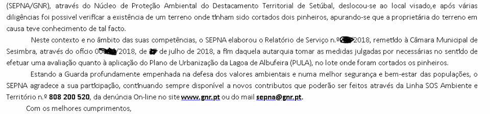 Como podem ver por imagens que nos chegam às mãos, a um grupo pequeno que tenta salvar a Lagoa de Albufeira, o SEPNA age mesmo em cumprimento da lei, quer seja em denúncias contra grandes empresas, quer seja contra pequenos proprietários que abatem as árvores nos seus terrenos (coisa que não podem fazer): Anexo 55 O PULA obriga a que se tenham 1 pinheiro por cada 200m2 de terreno normalmente, e só em condições muito especiais se pode cortar uma árvore, e ao mesmo tempo, os abates massivos que acontecem na lagoa por motivos económicos, ainda são mais razões para queixa. Não tenham problemas em denunciar ao SEPNA. Não pensem que se calhar já alguém denunciou porque a maioria não denuncia, e não tenham problemas em denunciar coisas com medo que sejam repetidas pois se forem eles juntam ao mesmo ofício. Denunciem SEMPRE abates de árvores na Lagoa de Albufeira, não à Câmara Municipal de Sesimbra que provavelmente vos ignorará, muito menos à GNR local que não fará nada quanto a isso segundo o que me tem sido dito, mas sim ao SEPNA. Eles por sua vez irão abrir ofício e remeter para a C.M.S. e depois poderemos pressionar a Câmara para saber como correm as coisas. Há que denunciar, sejam vocês proprietários ou meros visitantes, sempre que virem abates, denunciem, tirem fotos, enviem, etc. Nem proprietários podem cortar sem mais nem menos, lá porque o terreno é dele não significa que possam destruir uma parte da lagoa. Usem o email do SEPNA a ver se salvamos a Lagoa de Albufeira, obrigado. Post associado: https://www.facebook.com/LagoaAlbufe...type=3&theater. |